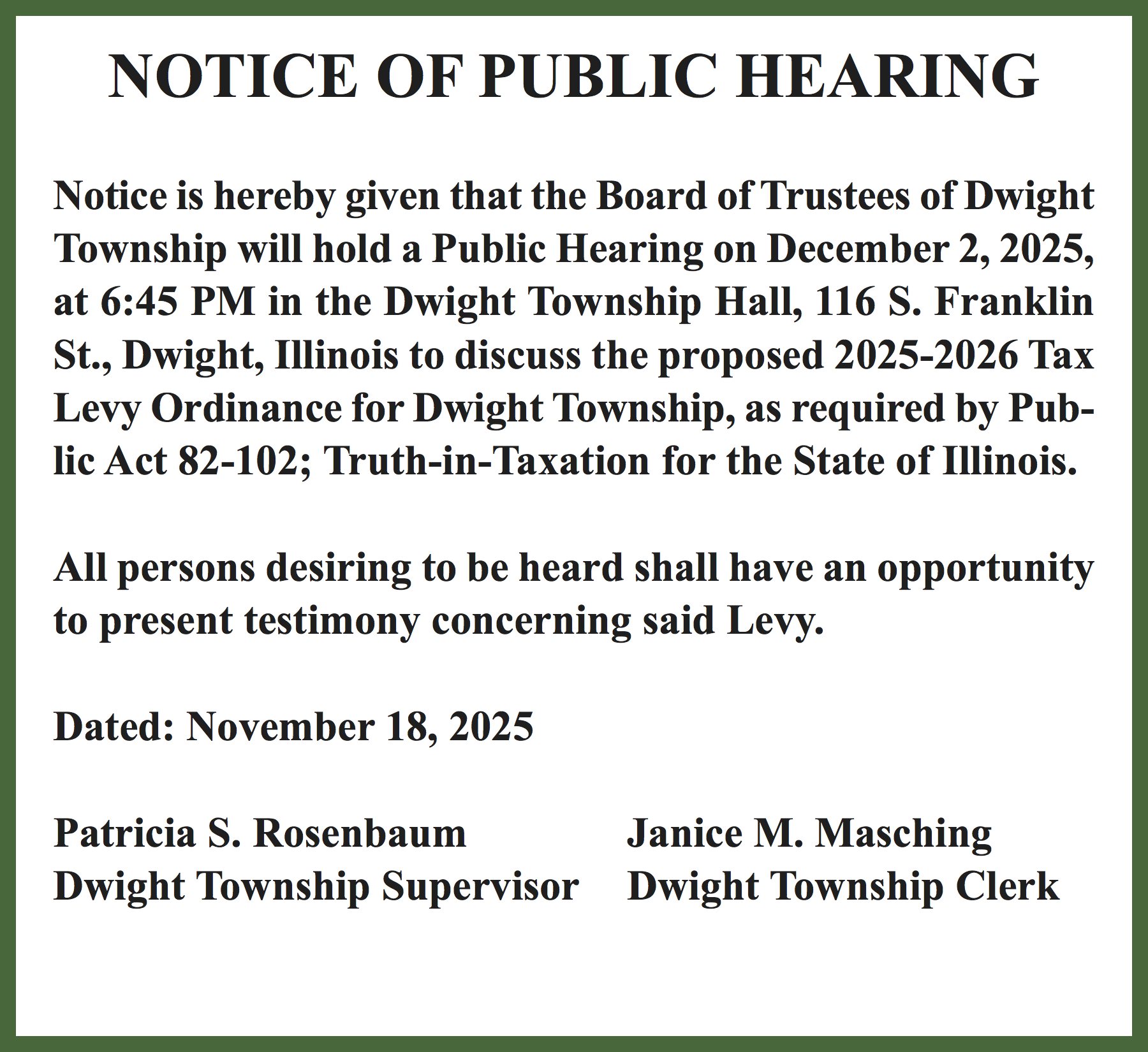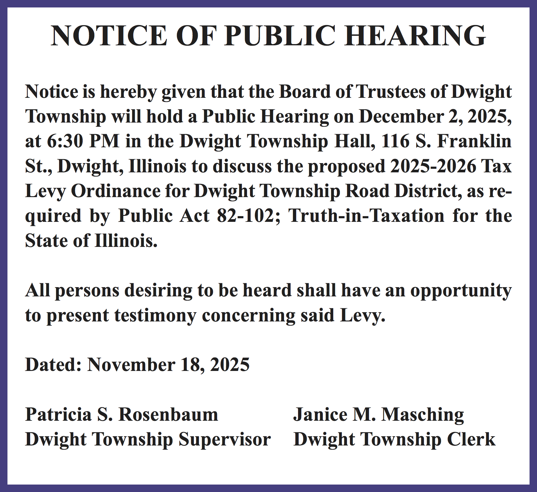 Dwight Historical Society Declines Dwight Township Request to Modify Pioneer Gothic Church Deed November 17, 2025 – The Dwight Historical Society held a special meeting Tuesday evening to discuss the situation concerning the Pioneer Gothic Church at 201 North Franklin…