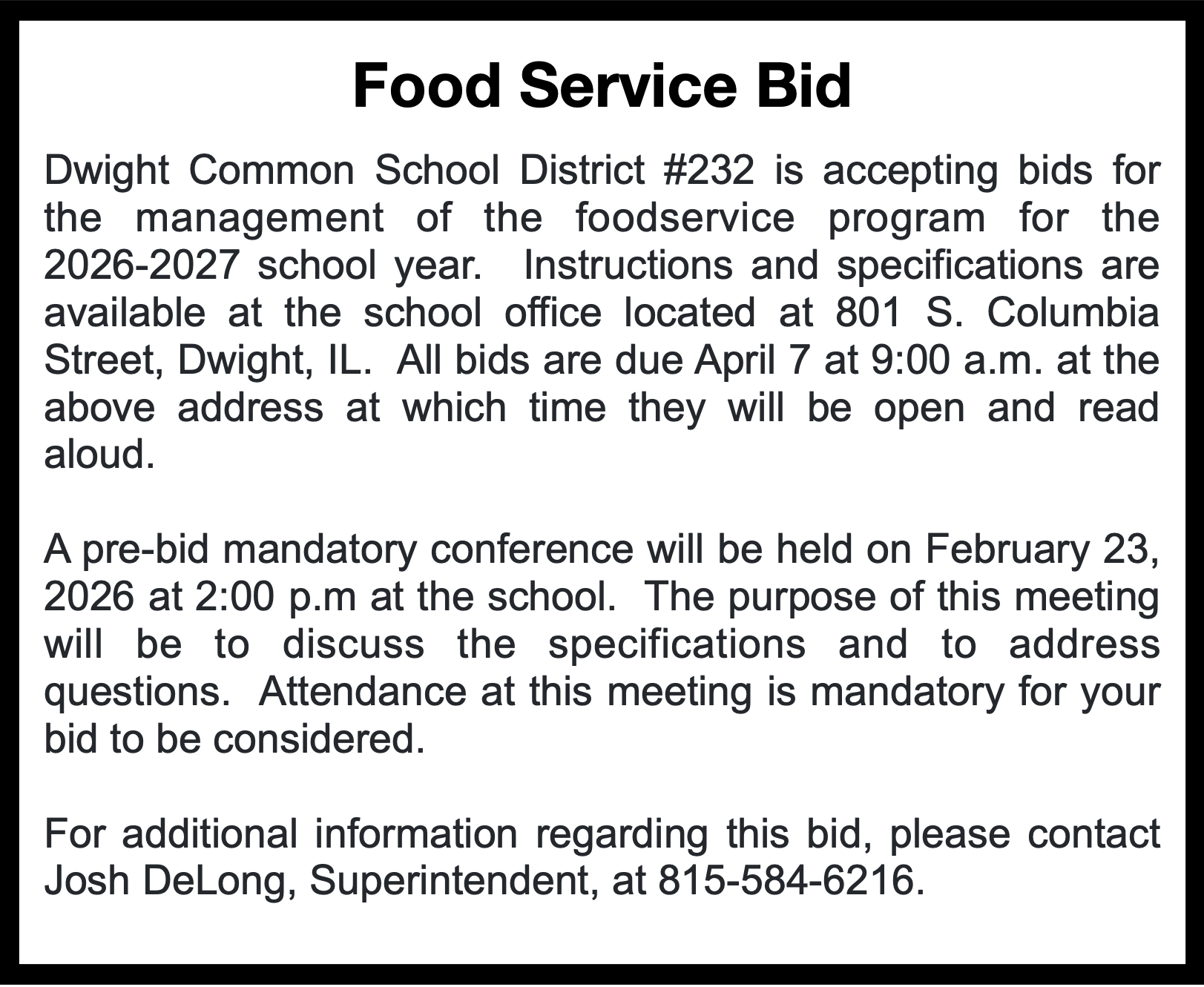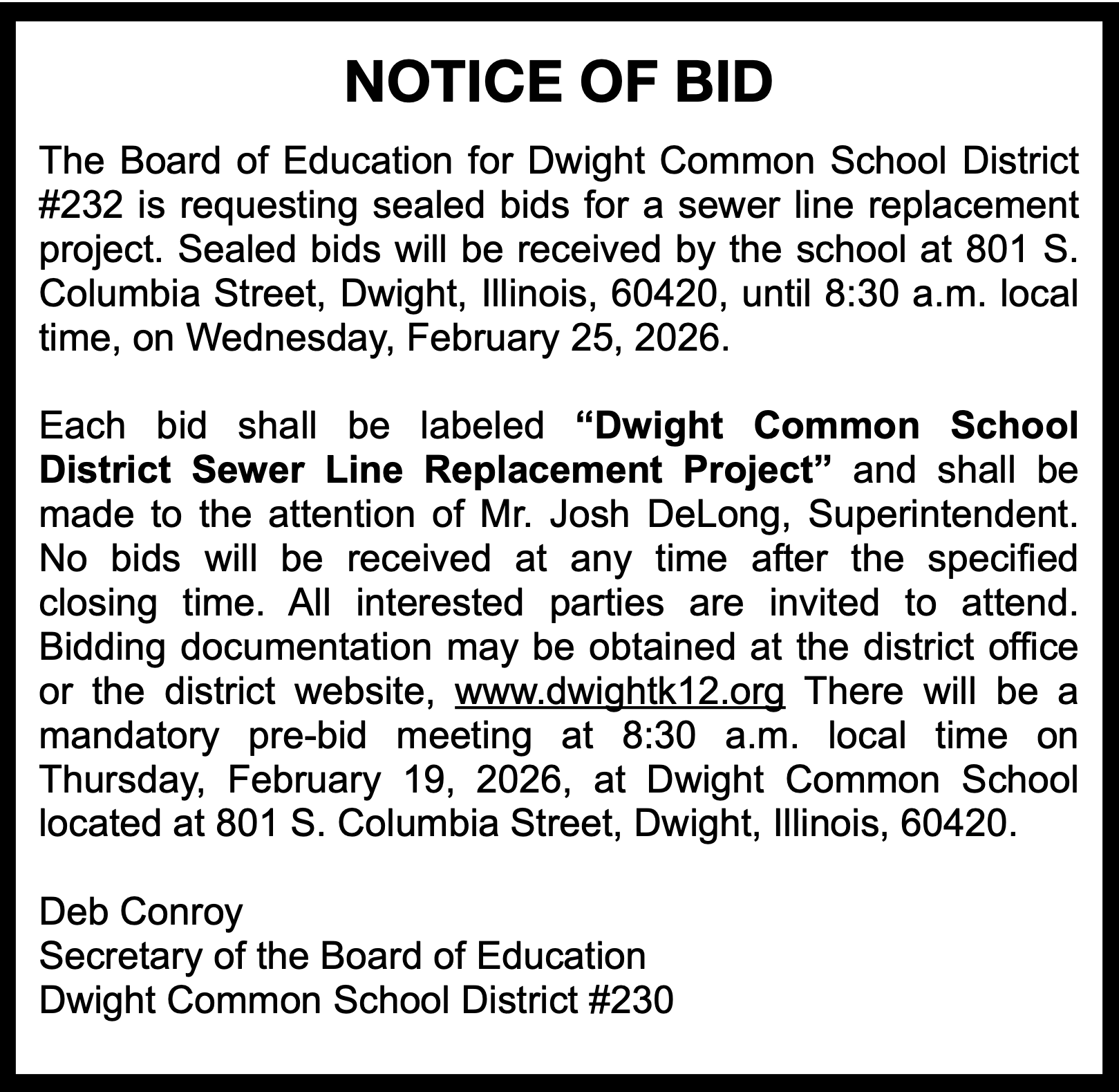 REGULAR MEETING OF THE BOARD OF EDUCATION OF DWIGHT COMMON SCHOOL DISTRICT #232 Held in the Dwight Common School District Library On February 11, 2026 at 6:00 p.m. Board Vice-President Mark Christenson called the meeting to order at 6:00 p.m….