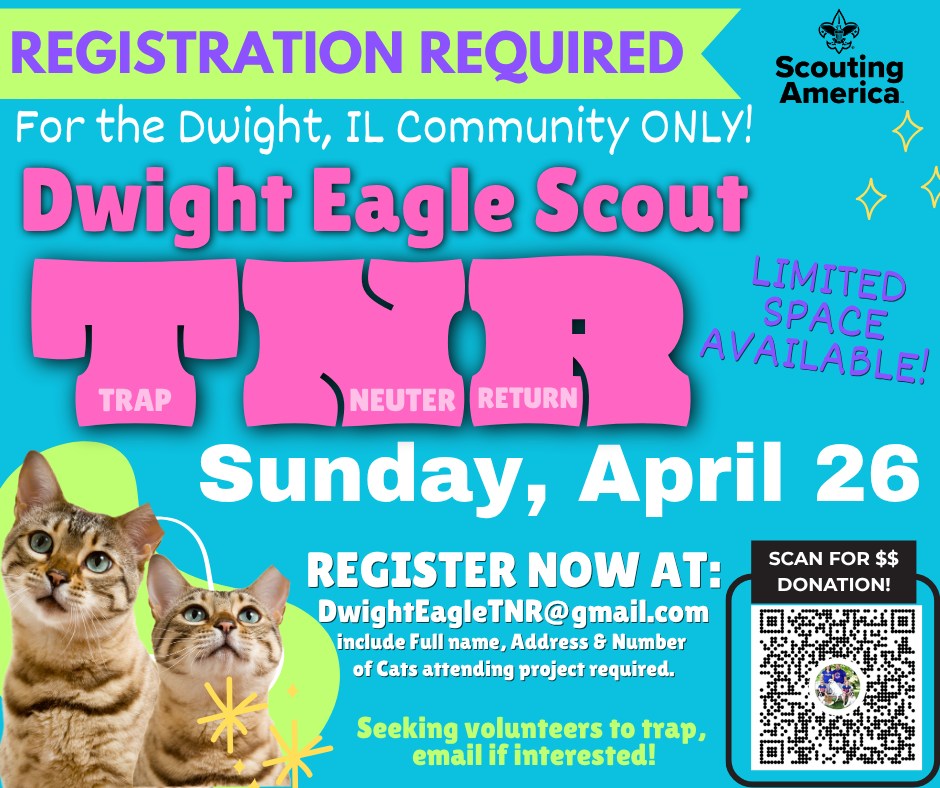 DWIGHT EAGLE SCOUT TNR PROJECT LED BY EMMA EGGENBERGER Dwight Eagle Scout TNR is a community-driven initiative led by Emma Eggenberger as part of her Scouting America Eagle Scout Project. This project focuses on humanely reducing the stray and feral…