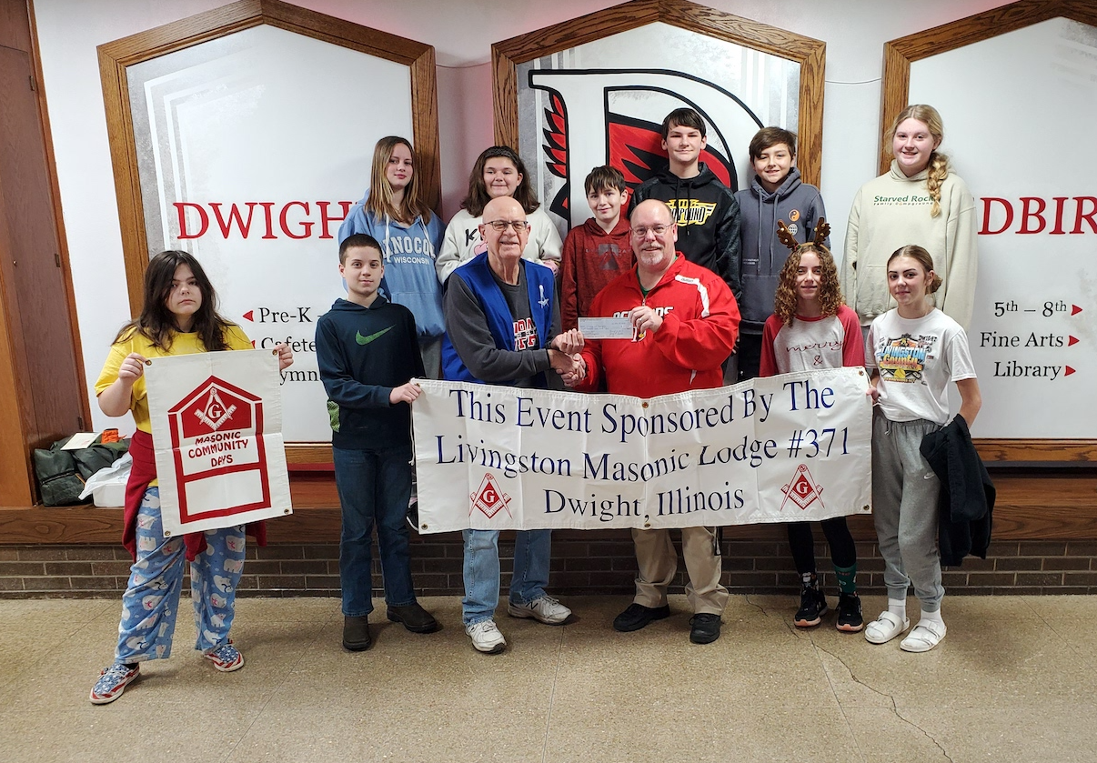 Jerry Curtis of Livingston Masonic Lodge #371 presents a $809.00 donation to the Dwight Common School Gang Resistance Education and Training (G.R.E.A.T.) program December 21st. Gary Beier, Dwight Schools Resource Officer, accepts the check. This is the 19th year that Livingston Masonic Lodge has sponsored the program. In the photo, front row from left are: