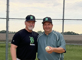 Dwight baseball coach Jerry McDowell picked up win number 600 after the Dwight Trojans defeated Streator Woodland 8–5 . McDowell is pictured here with longtime friend / coach