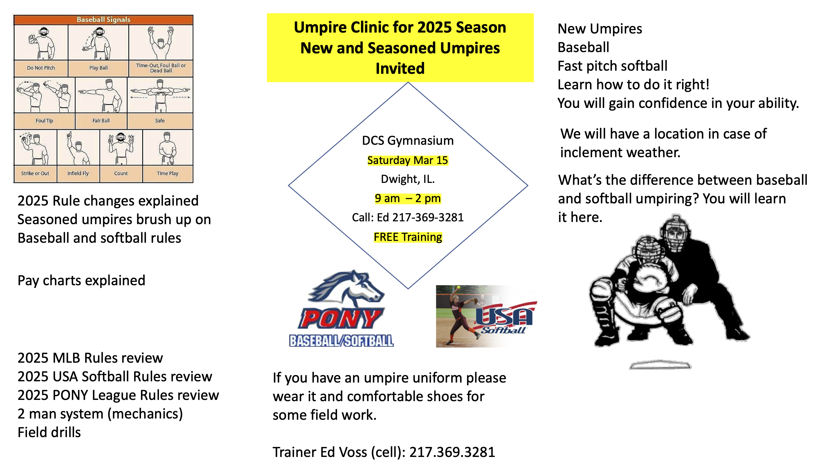 DYBS will be hosting our annual umpire clinic on Saturday, March 15th, at 9:00 a.m. till 2:00pm at Dwight Common Grade School. This clinic is free to attend and is for anyone 12 years old or older who would like to learn the skills and knowledge required to become an umpire this season. This is also a great refresher course for returning umpires.