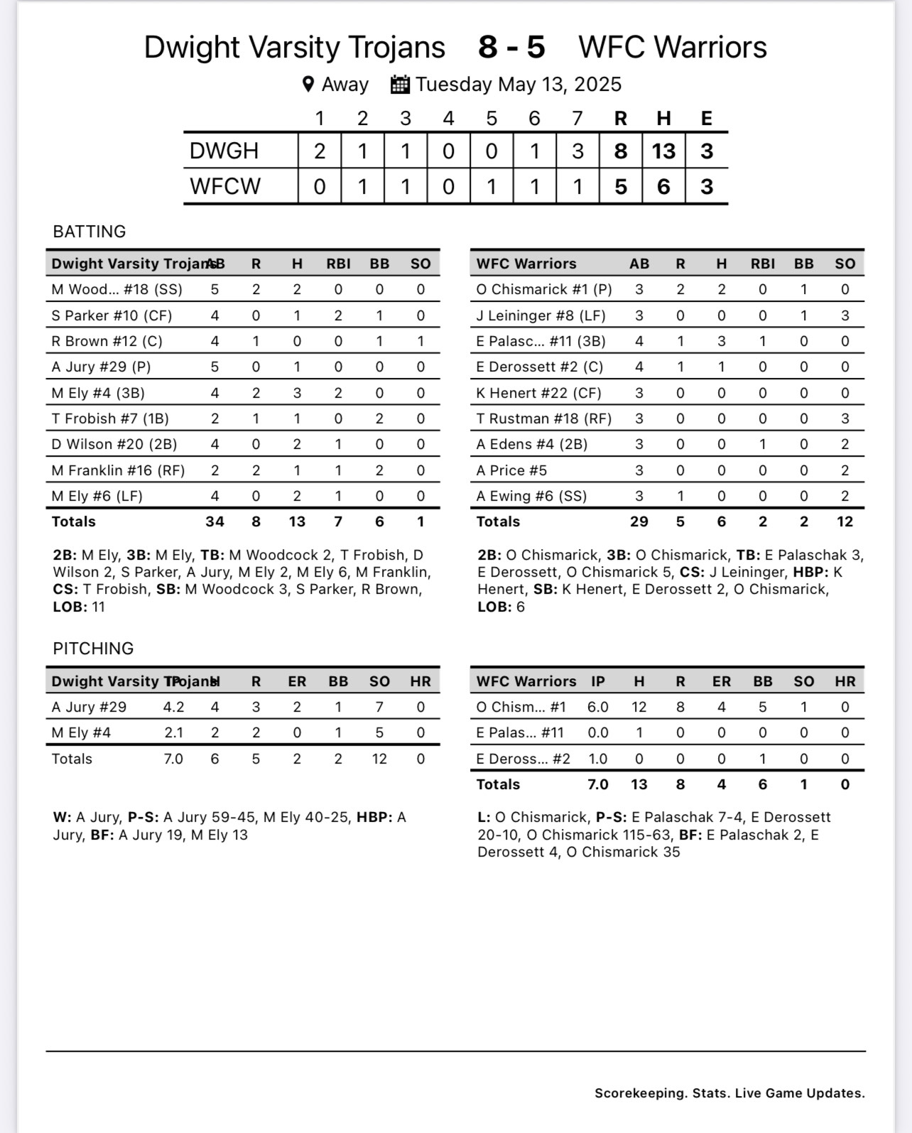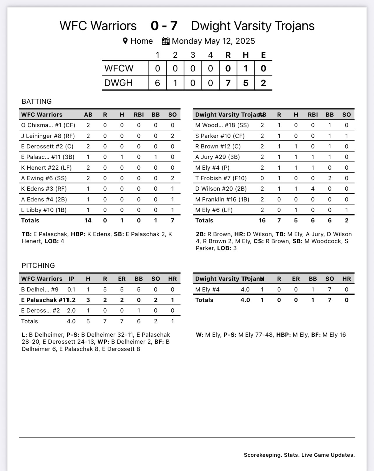 March 28 – Dwight Varsity Lady Trojans lost to Wilmington 15-0 in 4 innings.
