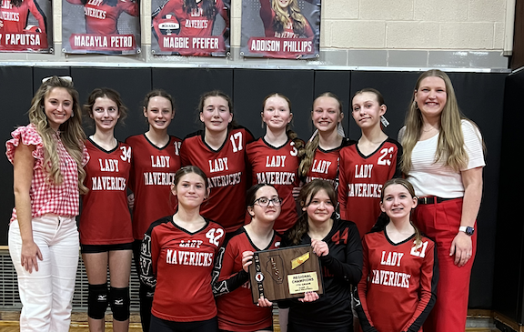 Back row left to right: Head Coach Macy McDowell, Harper Helland, Lyla Wilkinson, Cat Collet, Kenley Kruger, Maisie Hunt, Kayla Cole, and Assistant Coach Alanna Reeder.