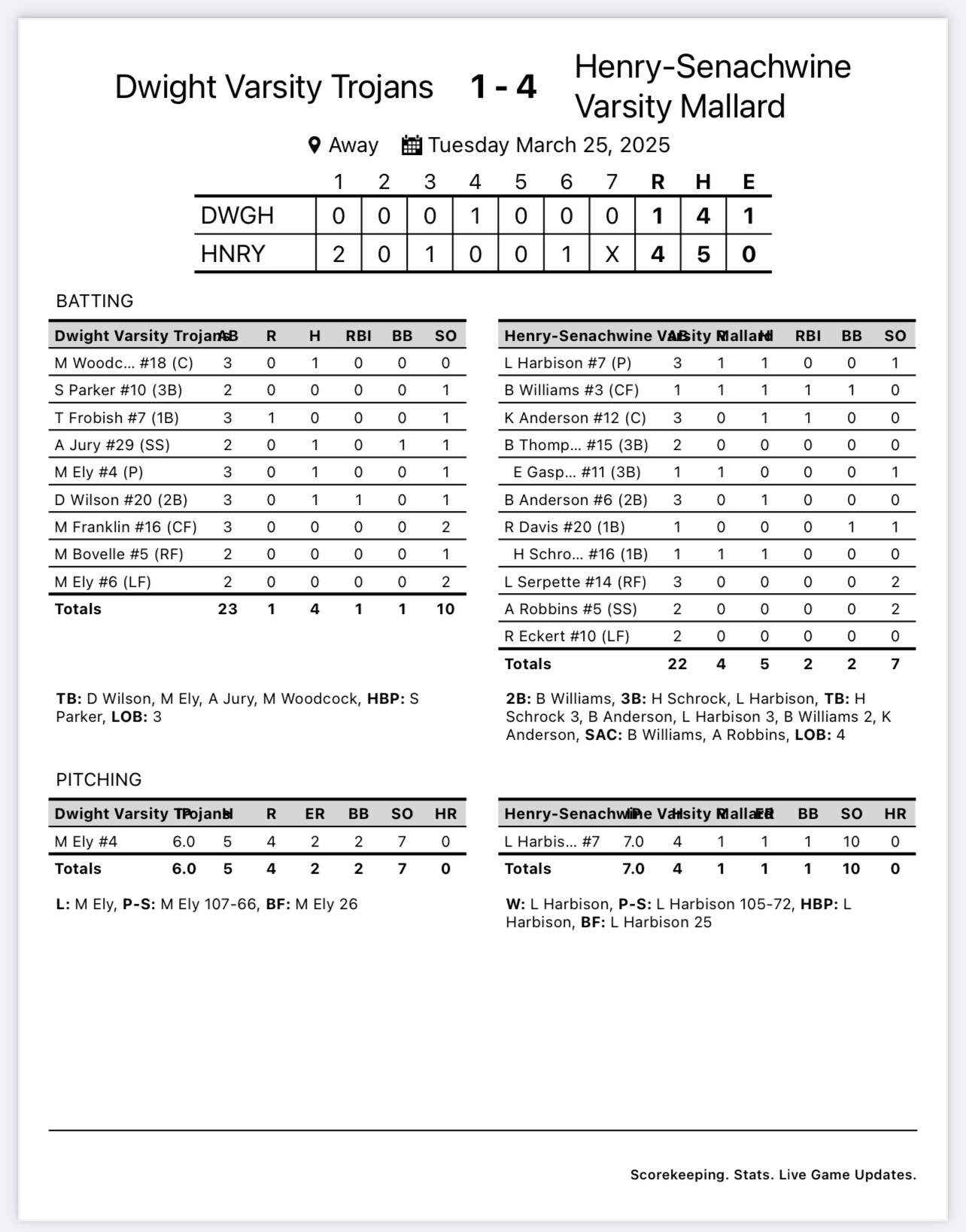 March 17 – Dwight Varsity Lady Trojans started their season with a conference game at St. Bede with a 6-4 loss Monday, March 17th.