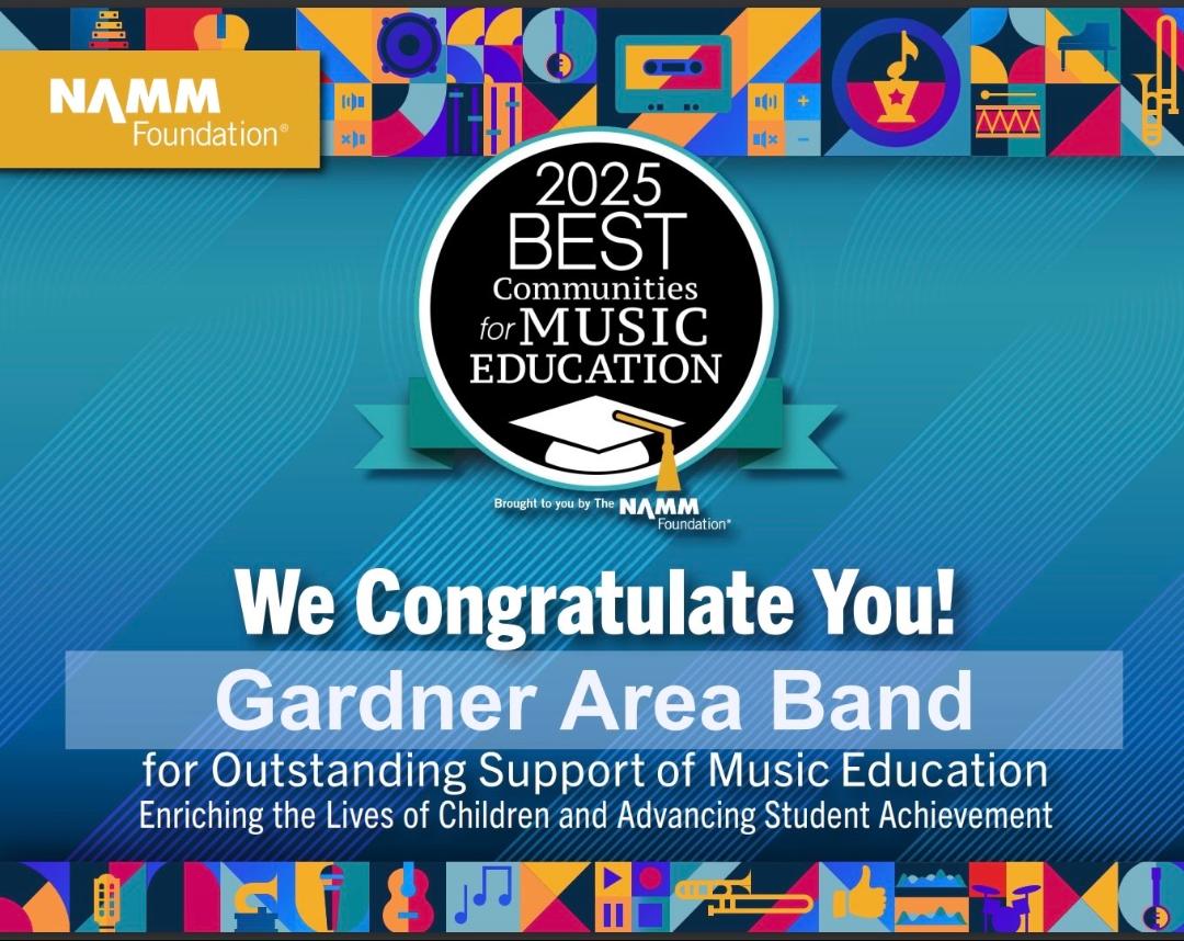 The Gardner Area Band has been honored with the Best Communities for Music Education designation from The NAMM Foundation for their outstanding support and commitment to music education. Now in its 26th year, the Best Communities for Music Education designation is awarded to districts that demonstrate outstanding achievement for providing music access and education to all students.