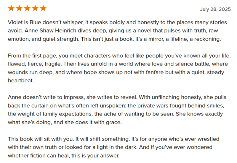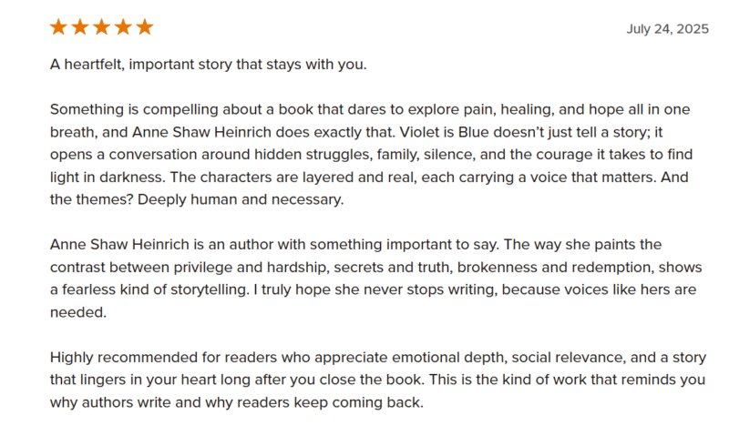 About the book: Violet Sellers is blue, and for good reason. When she makes a new friend in school, Jules Marks, who lives on the “other side of the tracks” with his five little sisters, she is introduced to a dark world of self-abuse. As Violet learns about Jules and his shifty mother, Lee, she retreats further into her shell. Her parents, Gloria and Skip, are horrified and do their best to find out what happened to their adolescent daughter while bending over backward to keep the whole town from knowing their business. Jules has an aunt and uncle who know his desperate story, and they finally get a chance to free him and his sisters out of a loveless world of poverty.