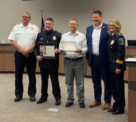 Morris Police Officer Nick Pampinella and civilian Jason Knapp of Glendale Heights were presented with awards for braveryat the City Council Meeting on 10-20-25, after their response to an incident at Stratton Park on August 2, 2025.
