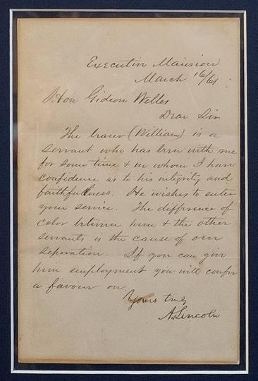 In the letter, the new president asks Navy Secretary Gideon Welles to find a job for a man who worked for the Lincoln family in Springfield and came with them to Washington. Lincoln says he would have given the man, an African American named William Johnson, a job at the White House but the other staff objected. “The difference of color between him and the other servants is the cause of our separation,” Lincoln wrote on March 16, 1861, just 12 days after taking the oath of office.