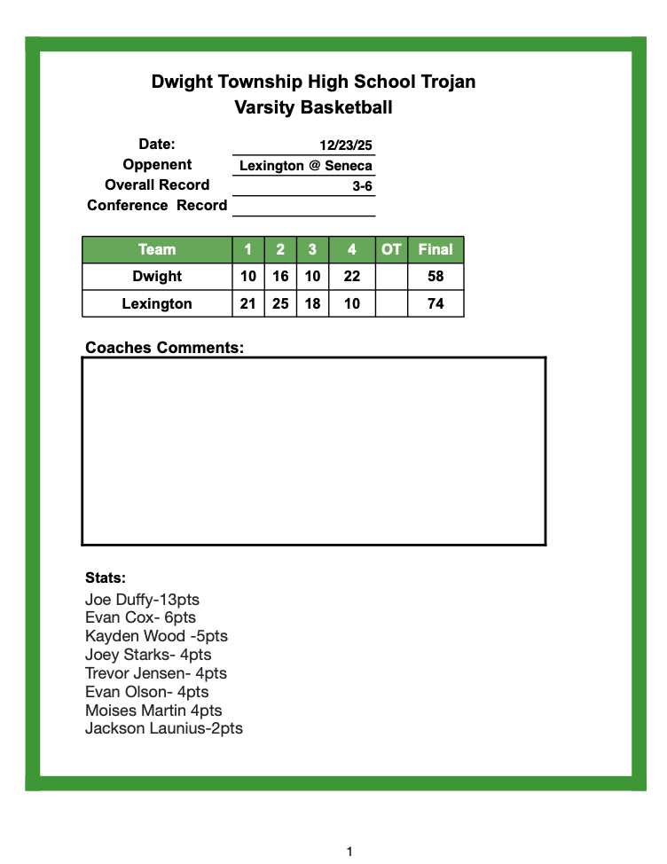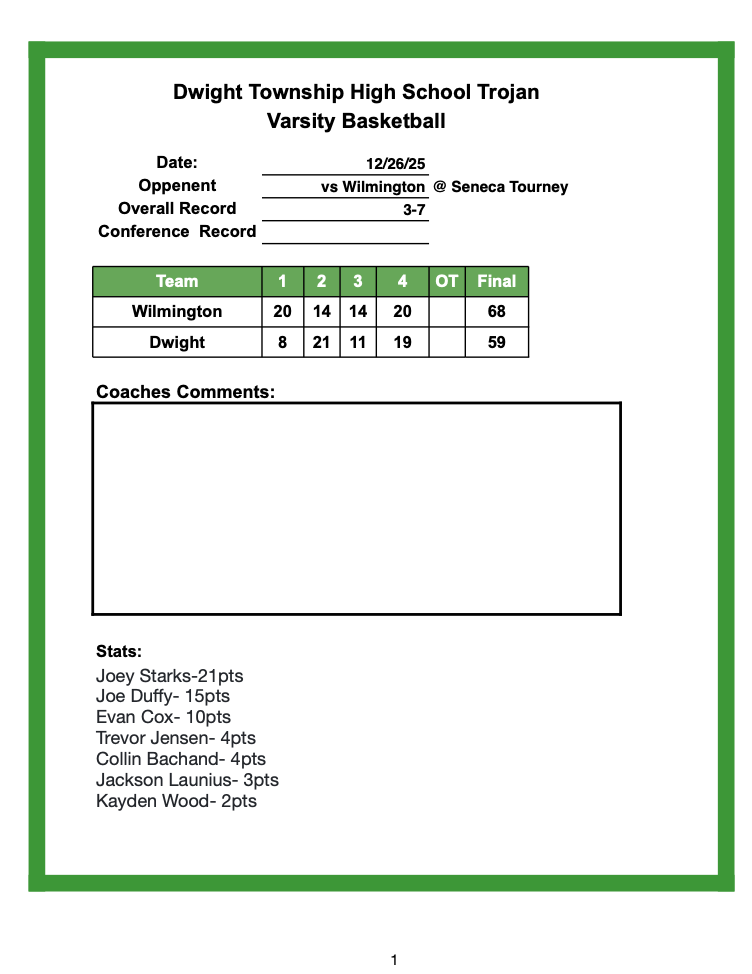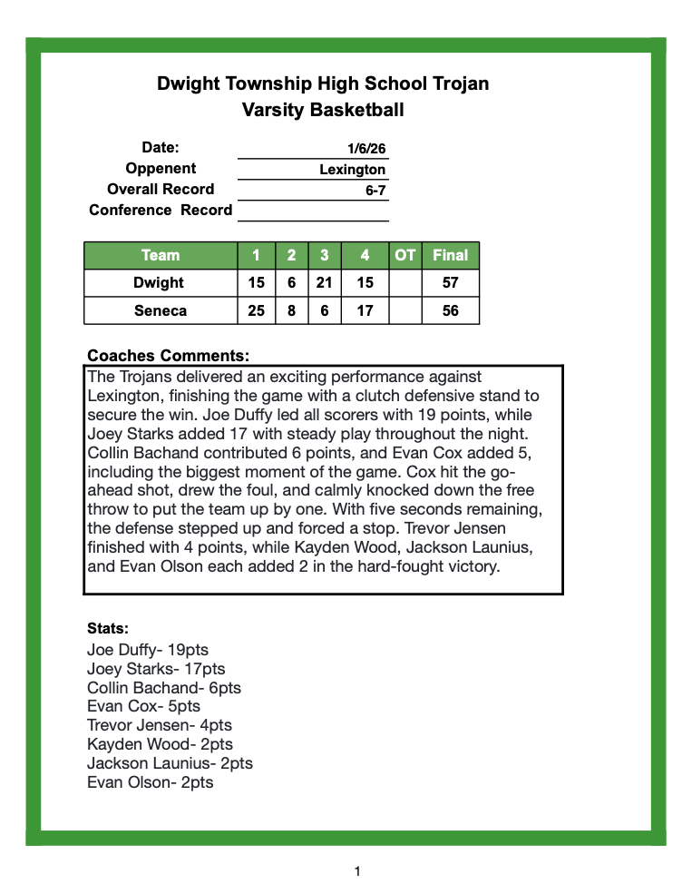 Joey Starks delivered a standout performance for the Trojans, pouring in 22 points and setting the tone offensively. Joe Duffy followed closely with 17 points, attacking the rim and keeping Dwight within striking distance during key stretches. Collin Bachand added 10 points, while Evan Cox chipped in 8, providing steady support on both ends of the floor.