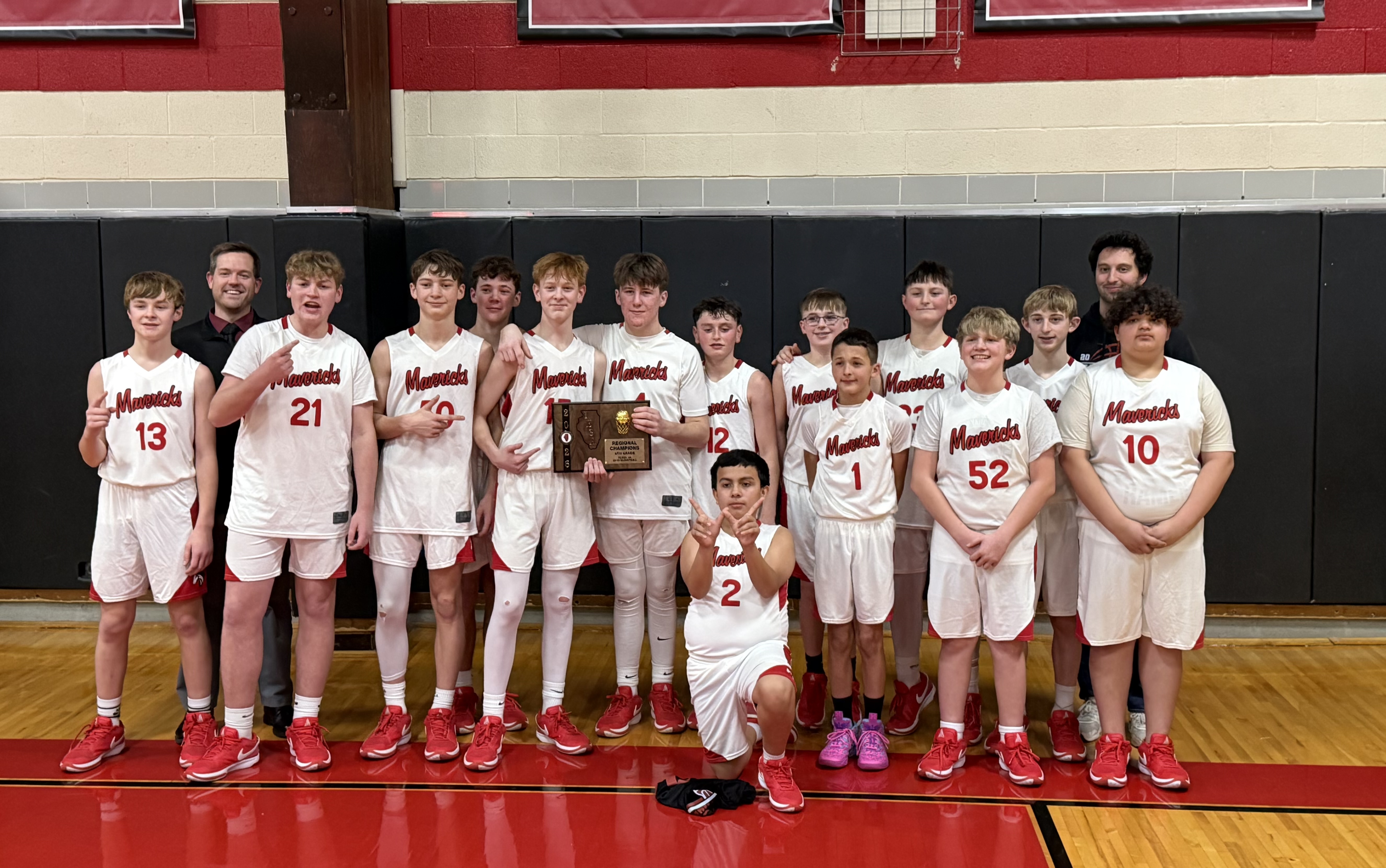 The MVK 8th grade boys basketball team won the IVC West conference tournament on Wednesday. In the semifinal, the Mavericks defeated Seneca 29-19. Bryce Biros scored 10 points and had 3 steals, and Olin Field scored 8 points and had 5 rebounds in that game for MVK. Cole Rowley scored 16 for Seneca.