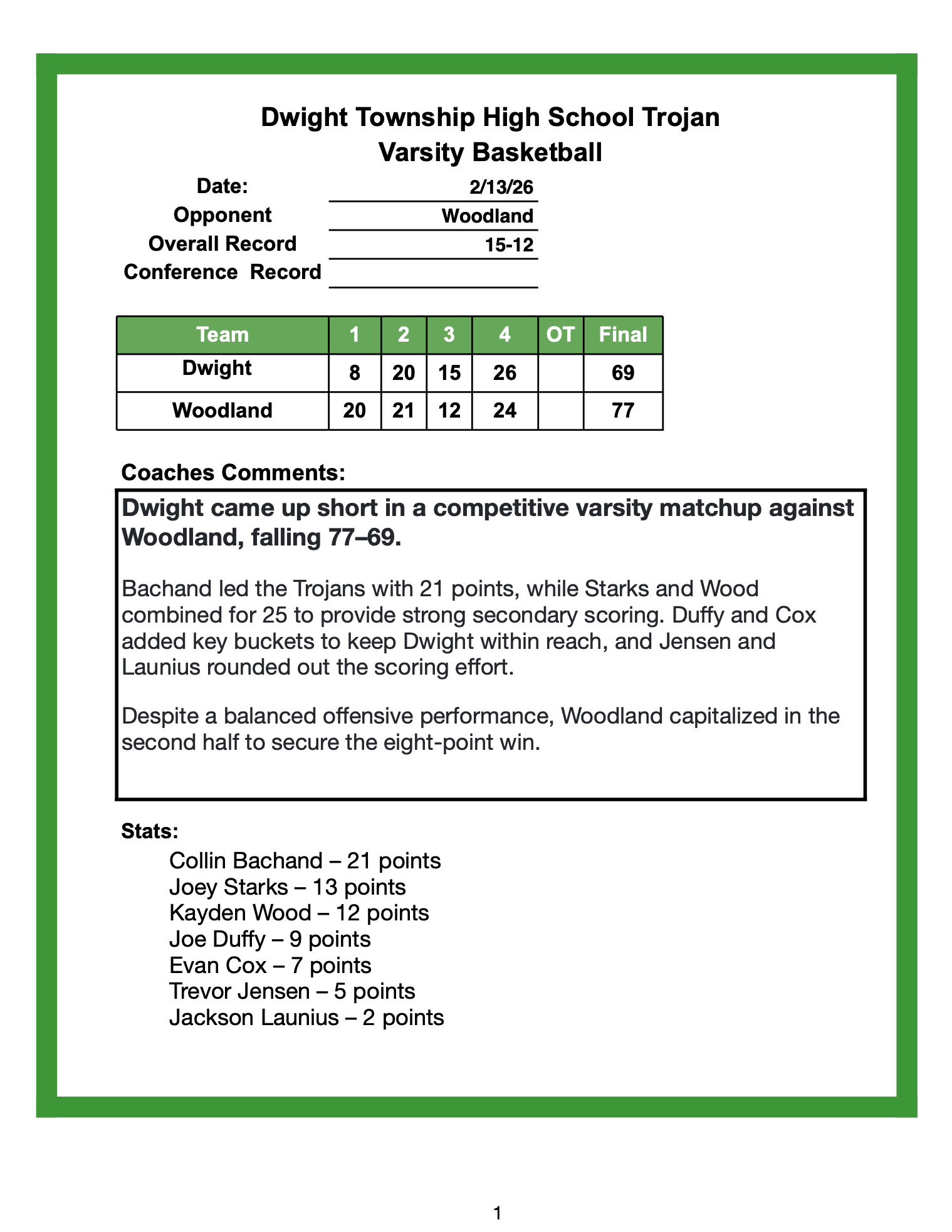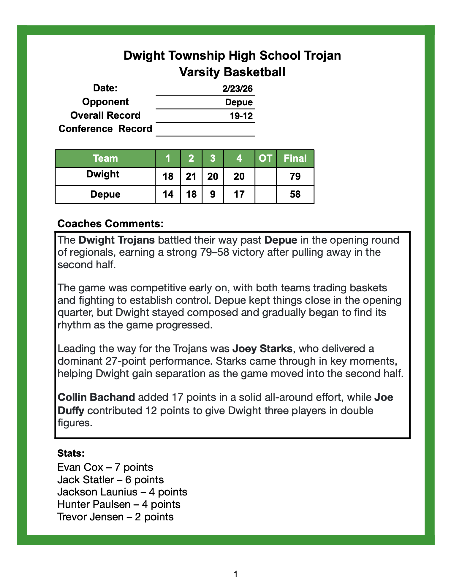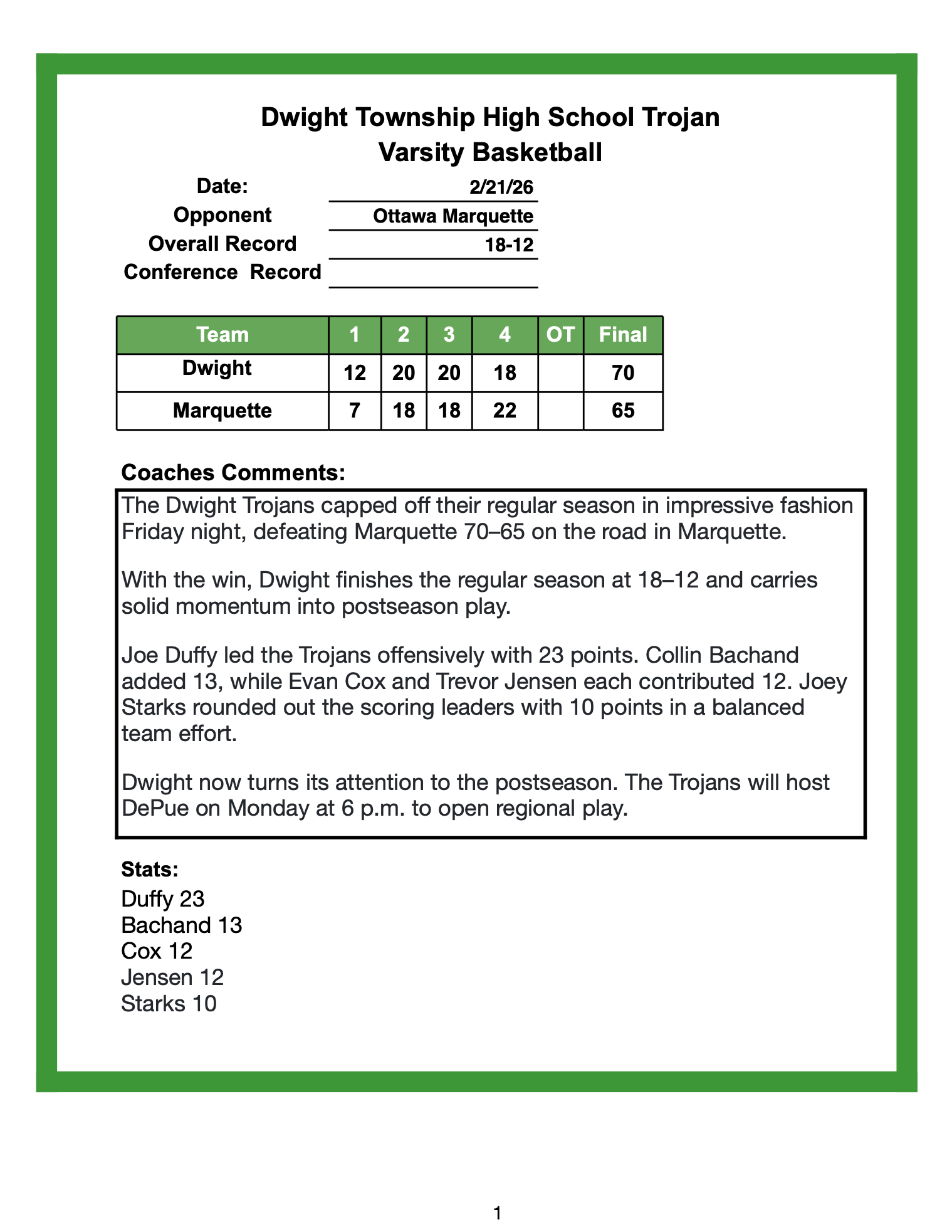 Dwight Boys ended the season with a 66-76 loss to St. Bede in the regional semifinals in Serena. Dwight finished the season 19-13. Scorers for Dwight. Collin Bachand-24, Joe Duffy-18, Trevor Jensen-8, Kayden Wood-6, Joey Starks-5, and Evan Cox-5