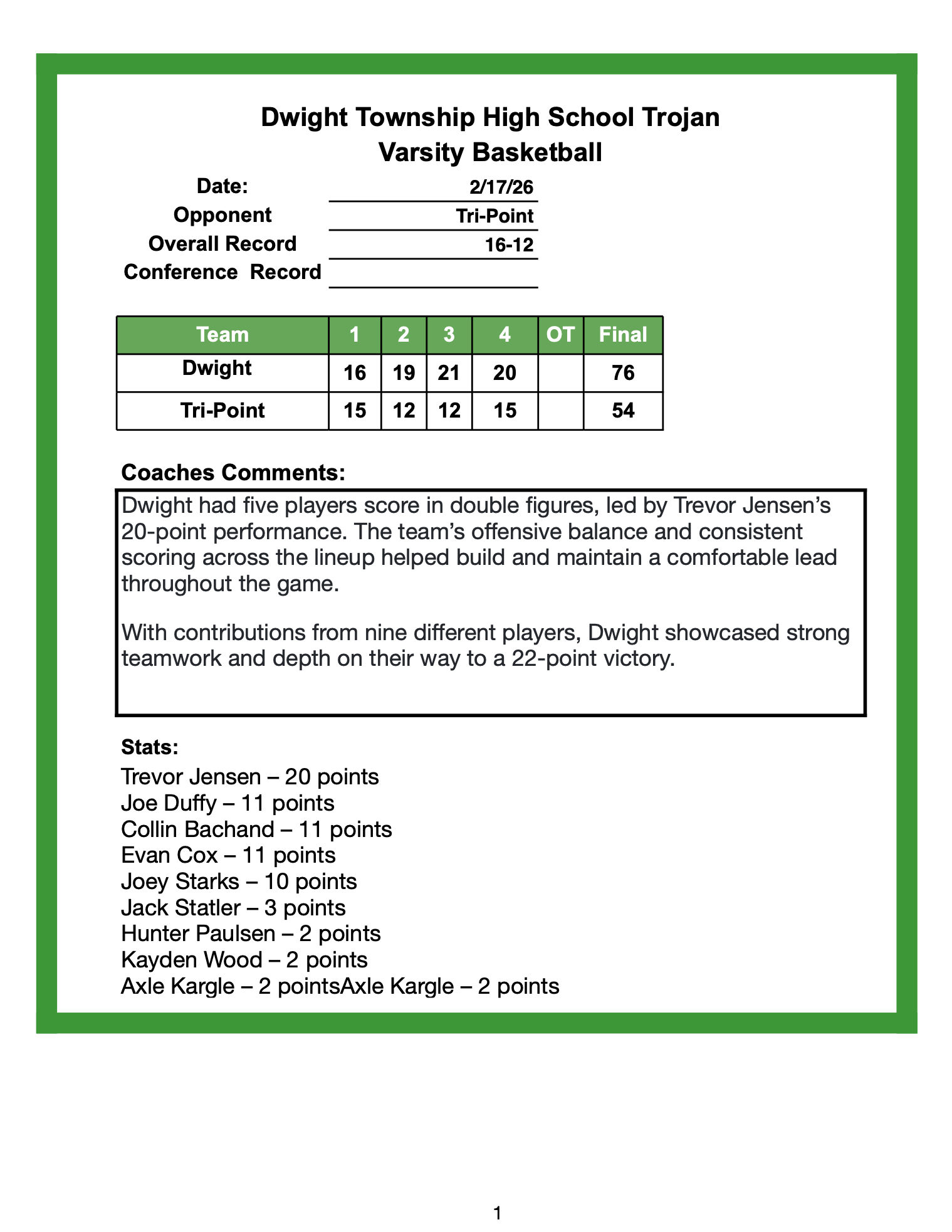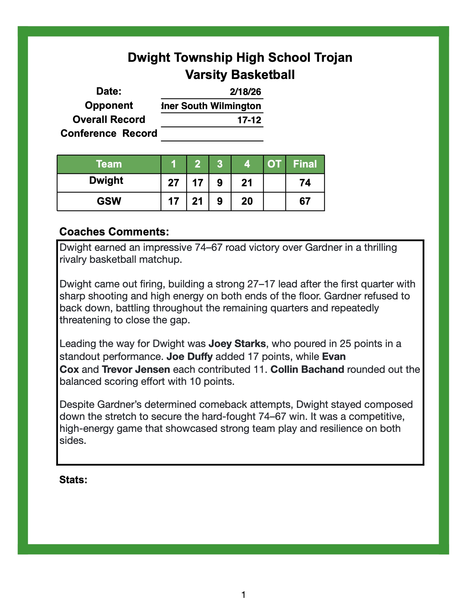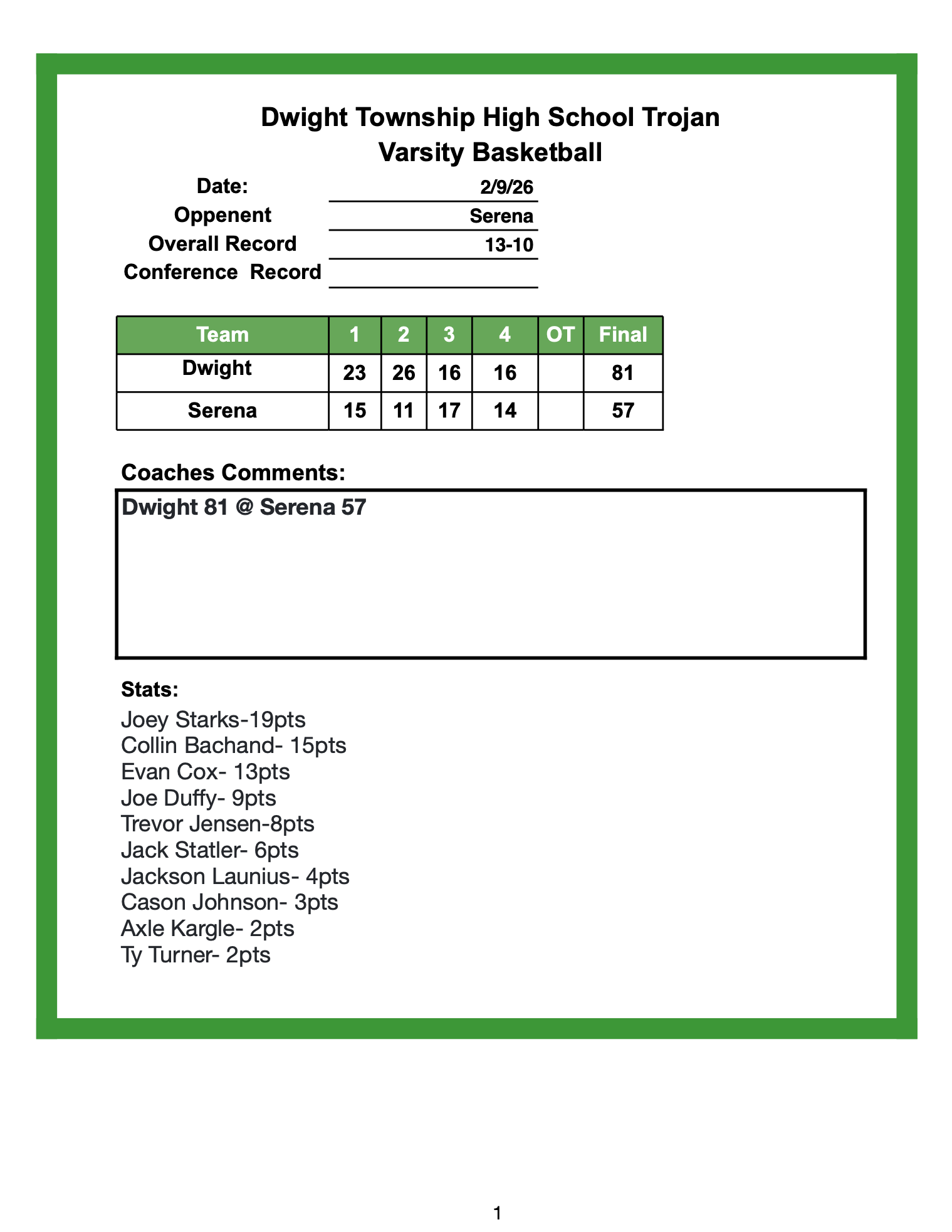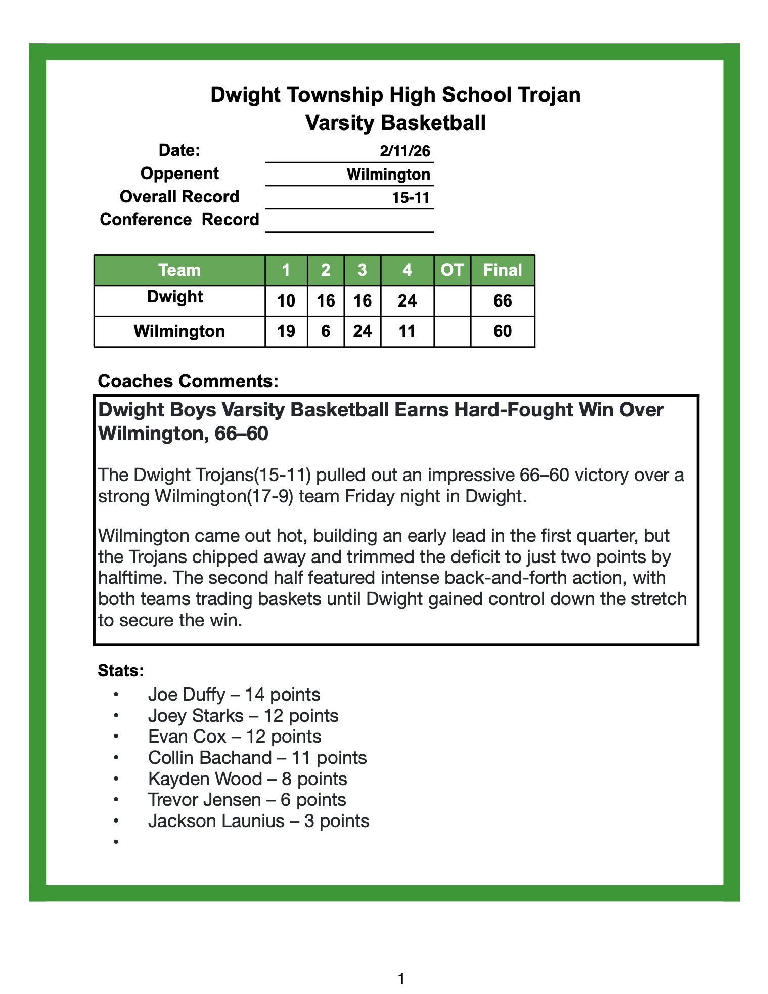 Dwight Boys ended the season with a 66-76 loss to St. Bede in the regional semifinals in Serena. Dwight finished the season 19-13. Scorers for Dwight. Collin Bachand-24, Joe Duffy-18, Trevor Jensen-8, Kayden Wood-6, Joey Starks-5, and Evan Cox-5