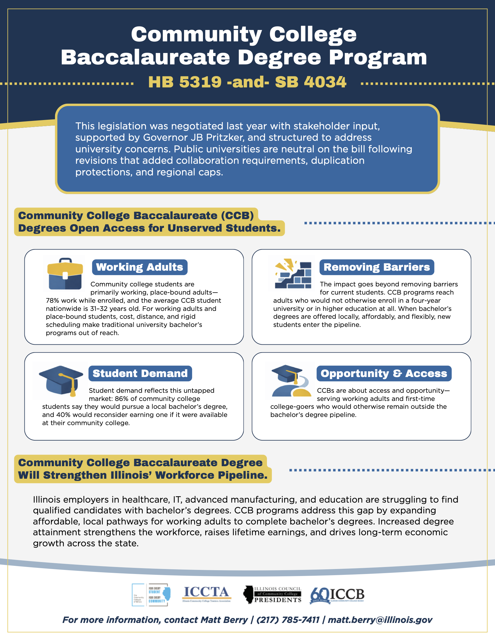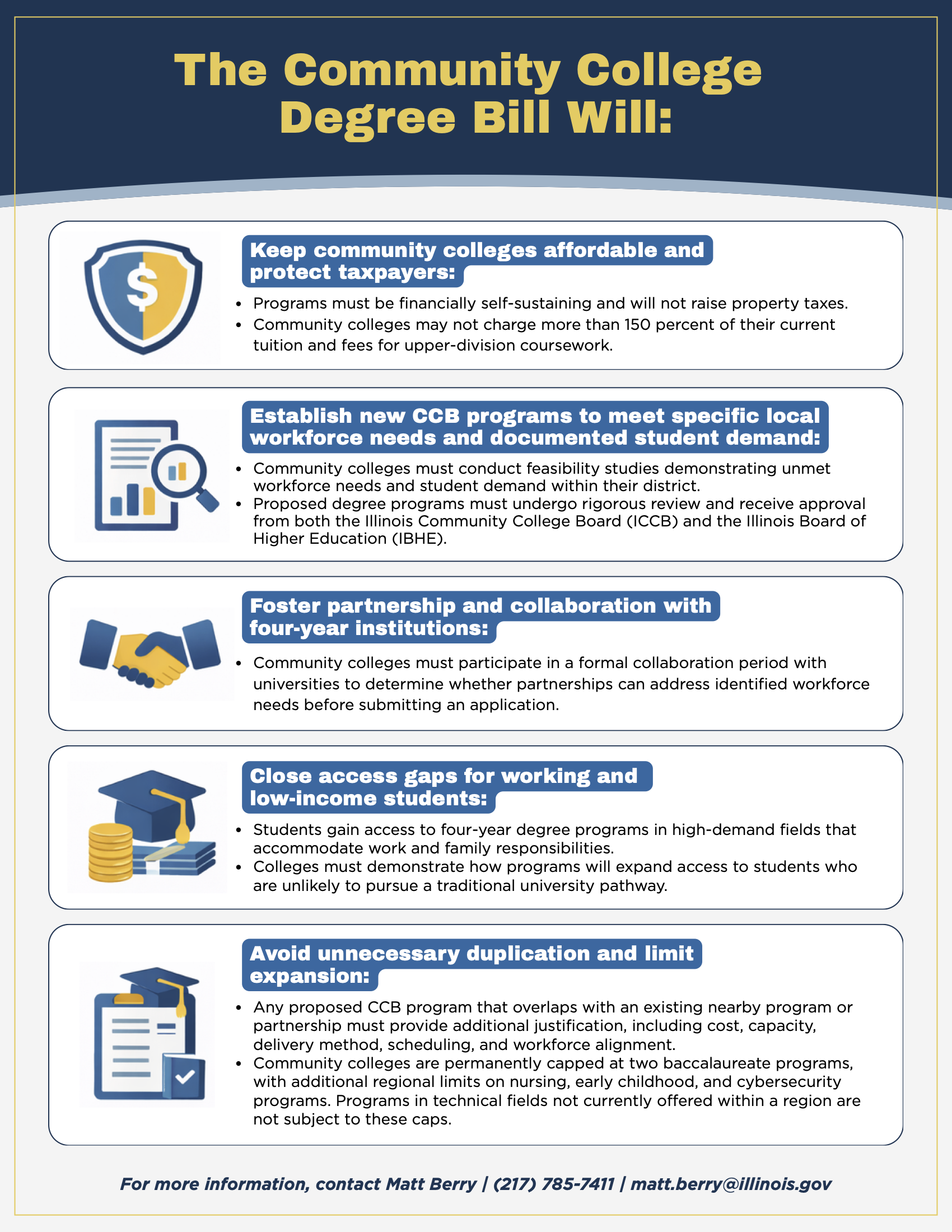 Community college students—most of whom work while enrolled—often face barriers like travel, cost, and scheduling conflicts when pursuing traditional four‑year degrees. Local bachelor’s degree pathways would help more students complete their education close to home while meeting employer demand for advanced credentials. Illinois would join 24 other states that already authorize community college baccalaureate programs.
