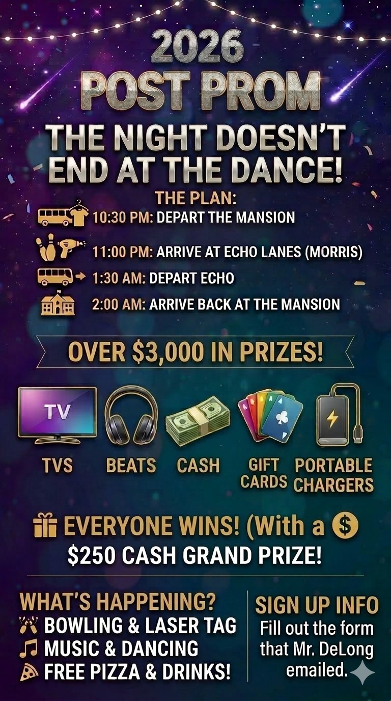We already have a lot of students signed up to attend post-prom on Saturday, April 25th. The deadline to sign up is Wednesday, April 15th. All students who sign up are expected to attend. Parents will be notified before leaving town if their student is not on the bus. We have had an overwhelming response from local businesses and families to help make this night possible. A HUGE thank you to the following businesses and families.