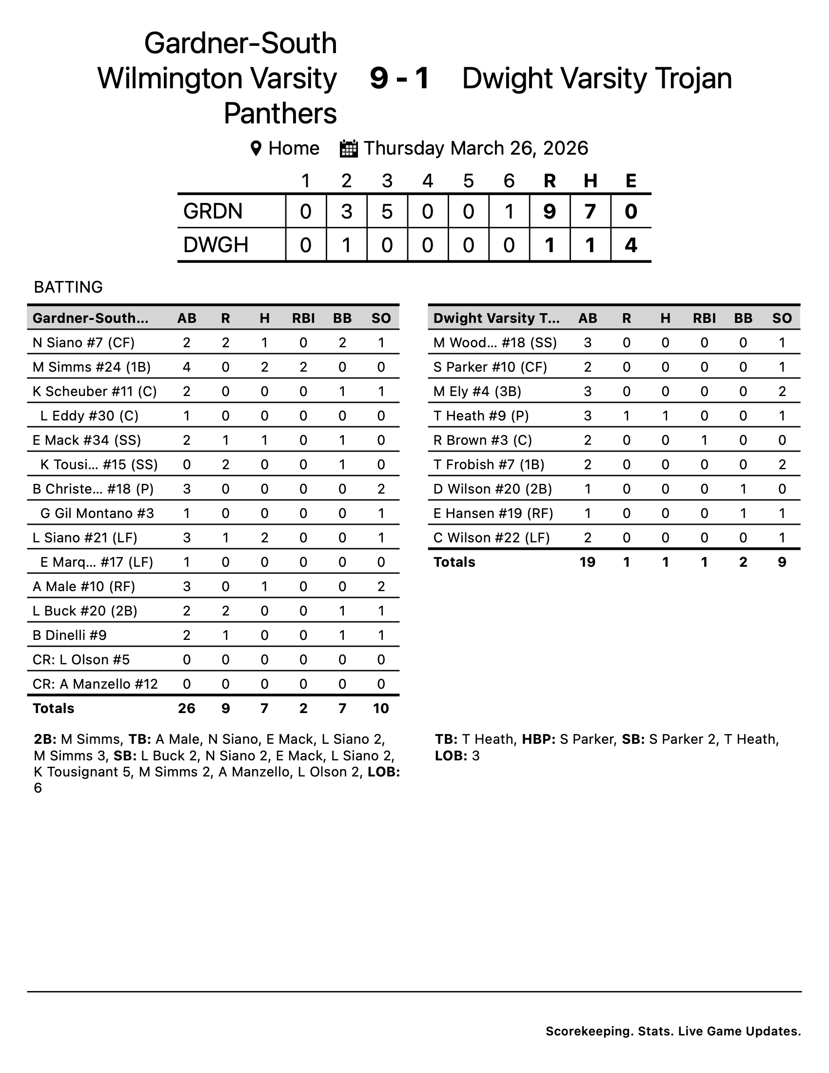 | Team Totals | .259 | 30 | 27 | 4 | 7 | 4 | 2 | 0 | 0 | ||