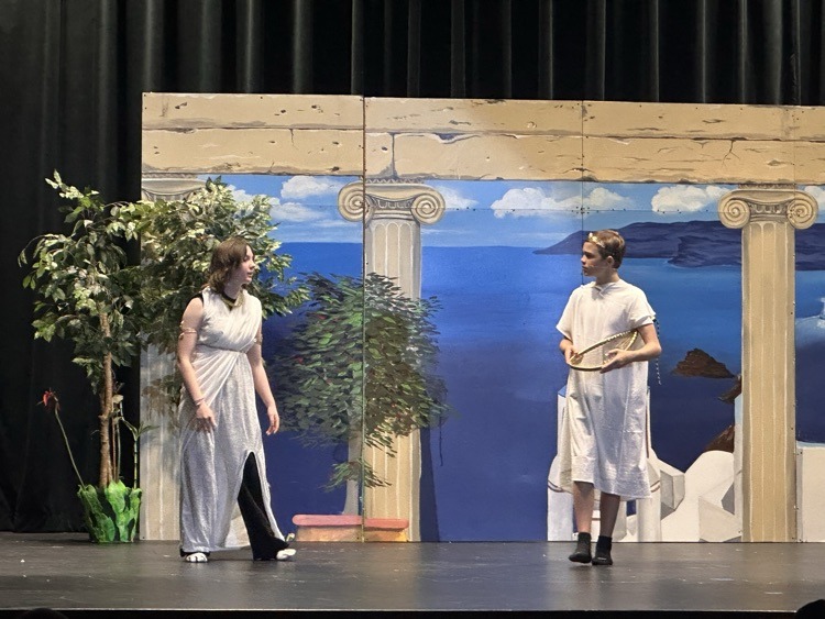 The Redbird Drama Company took the stage presenting Myth-Guided, under Director Ms. McCullough and the 8th graders, this past weekend at the DTHS Auditorium Friday and Saturday nights. A Cast and Crew of thirty-eight DCS students created two spectacular evenings of entertainment as American Tourists, on a Bernie Flinders Fantastic Tour. They flew from Chicago, IL to Athens, Greece to view the infamous Sculpture Garden featuring the Greek gods and goddesses of old. But, Hermes, Zeus and all the statues seemed oddly strange–they moved and told of the myths behind their names. It was fun follow-the-flag theater for all!